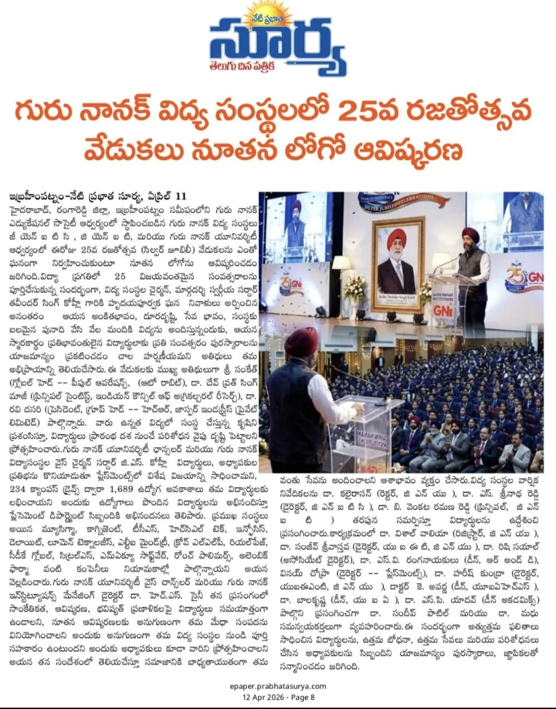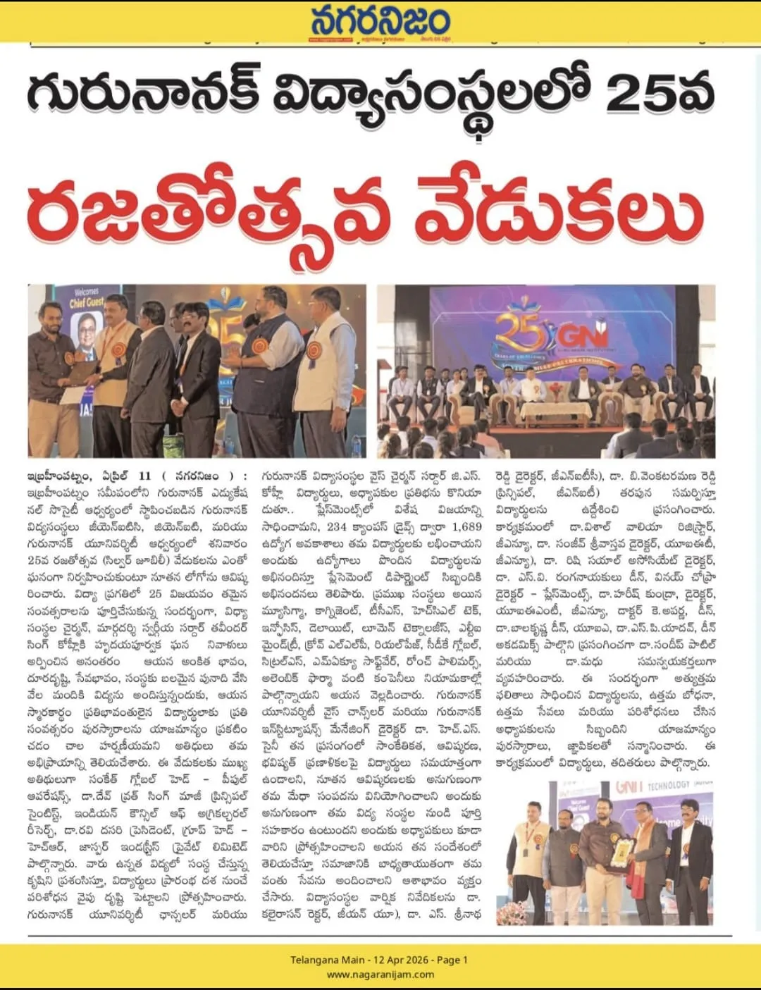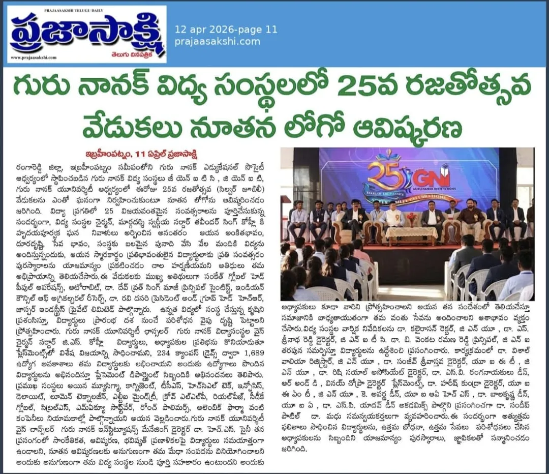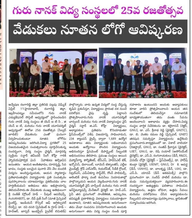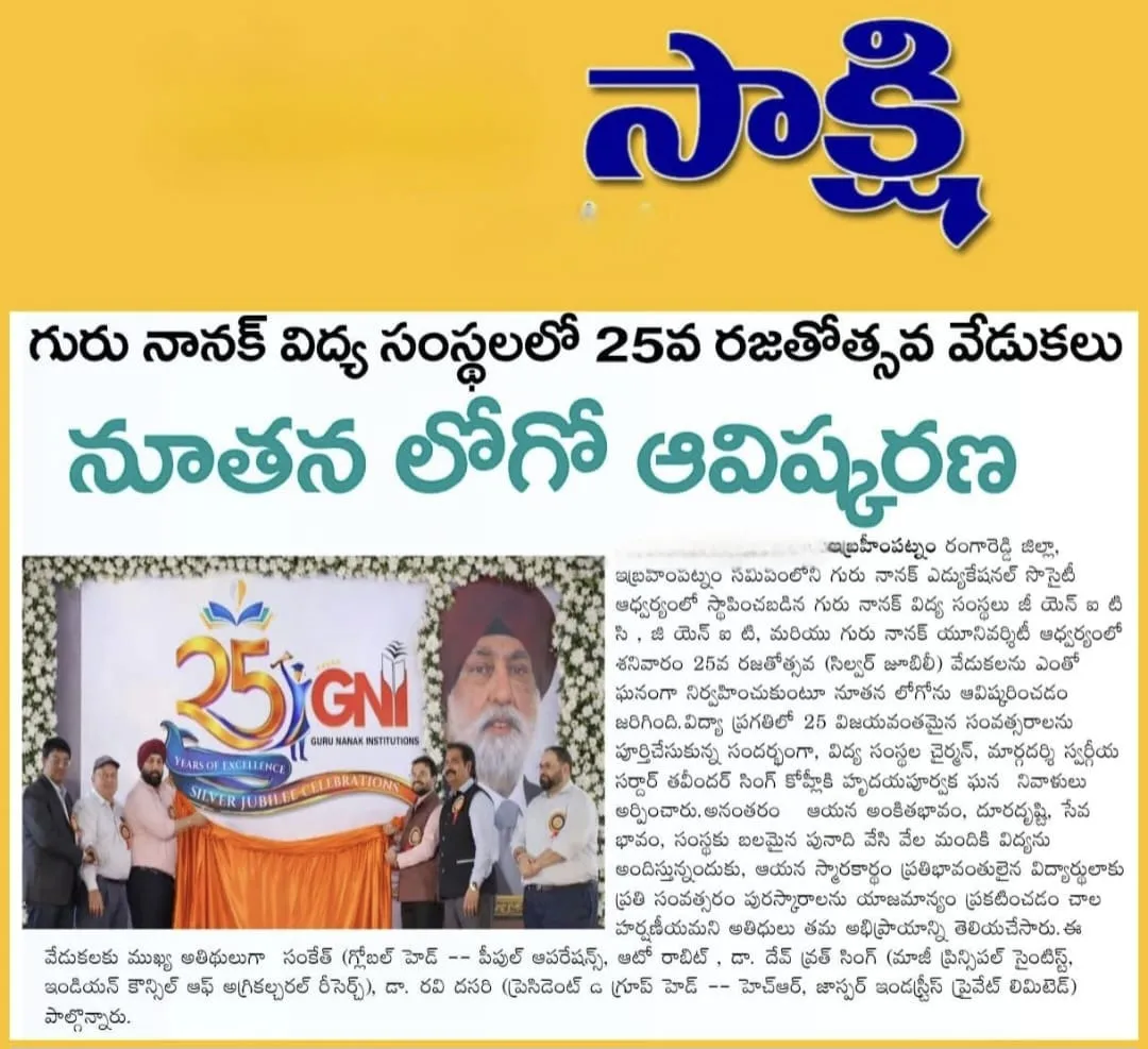 Guru Nanak Institutions—comprising Guru Nanak Institutions Technical Campus (GNITC), Guru Nanak Institute of Technology (GNIT), and Guru Nanak University (GNU), established under the aegis of the Guru Nanak Educational Society near Ibrahimpatnam—celebrated their 25th Silver Jubilee with great grandeur and enthusiasm. On this significant occasion, a new institutional logo was officially unveiled, marking a milestone in their journey of academic excellence.