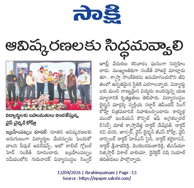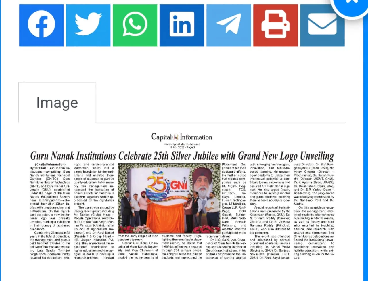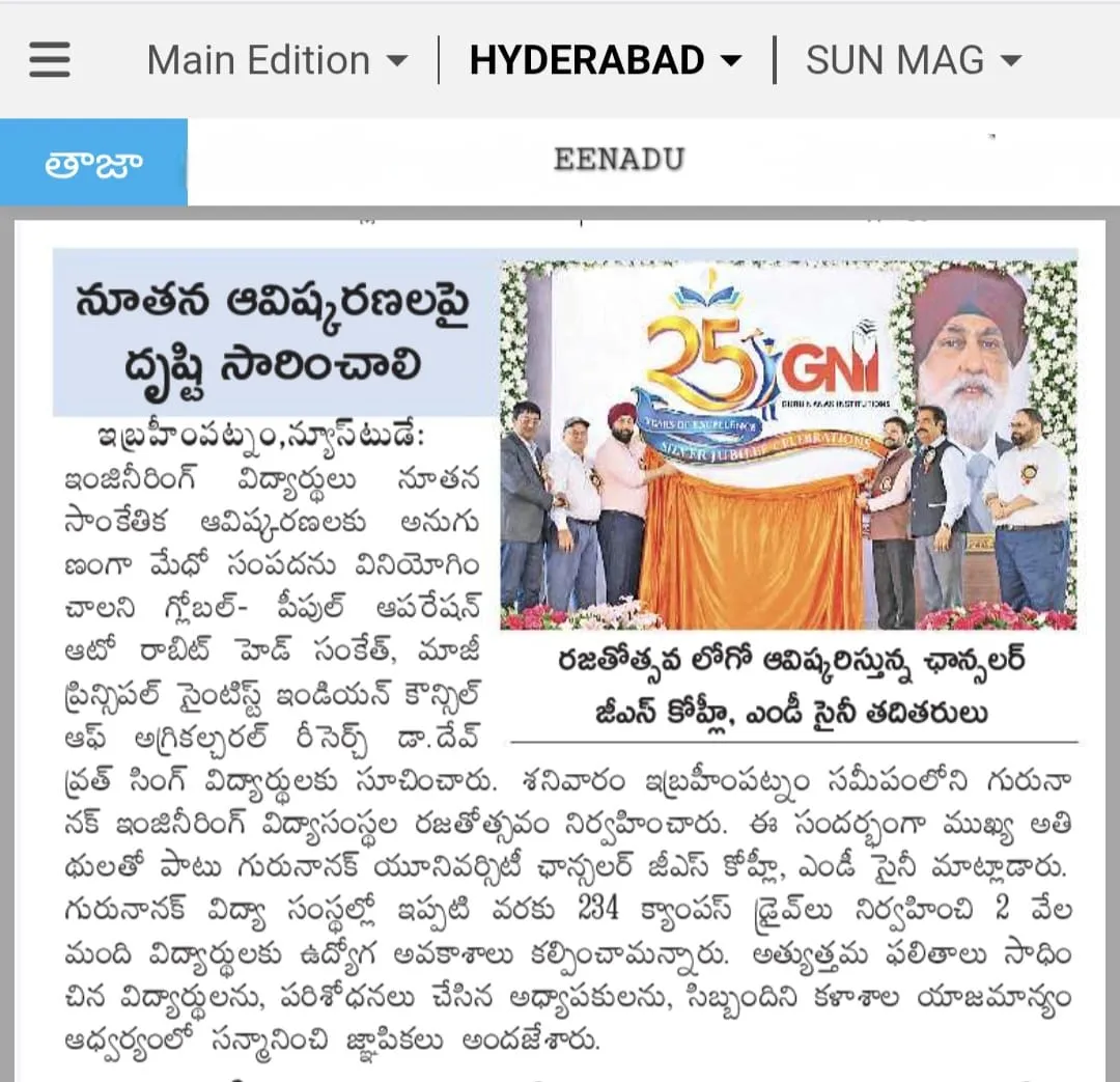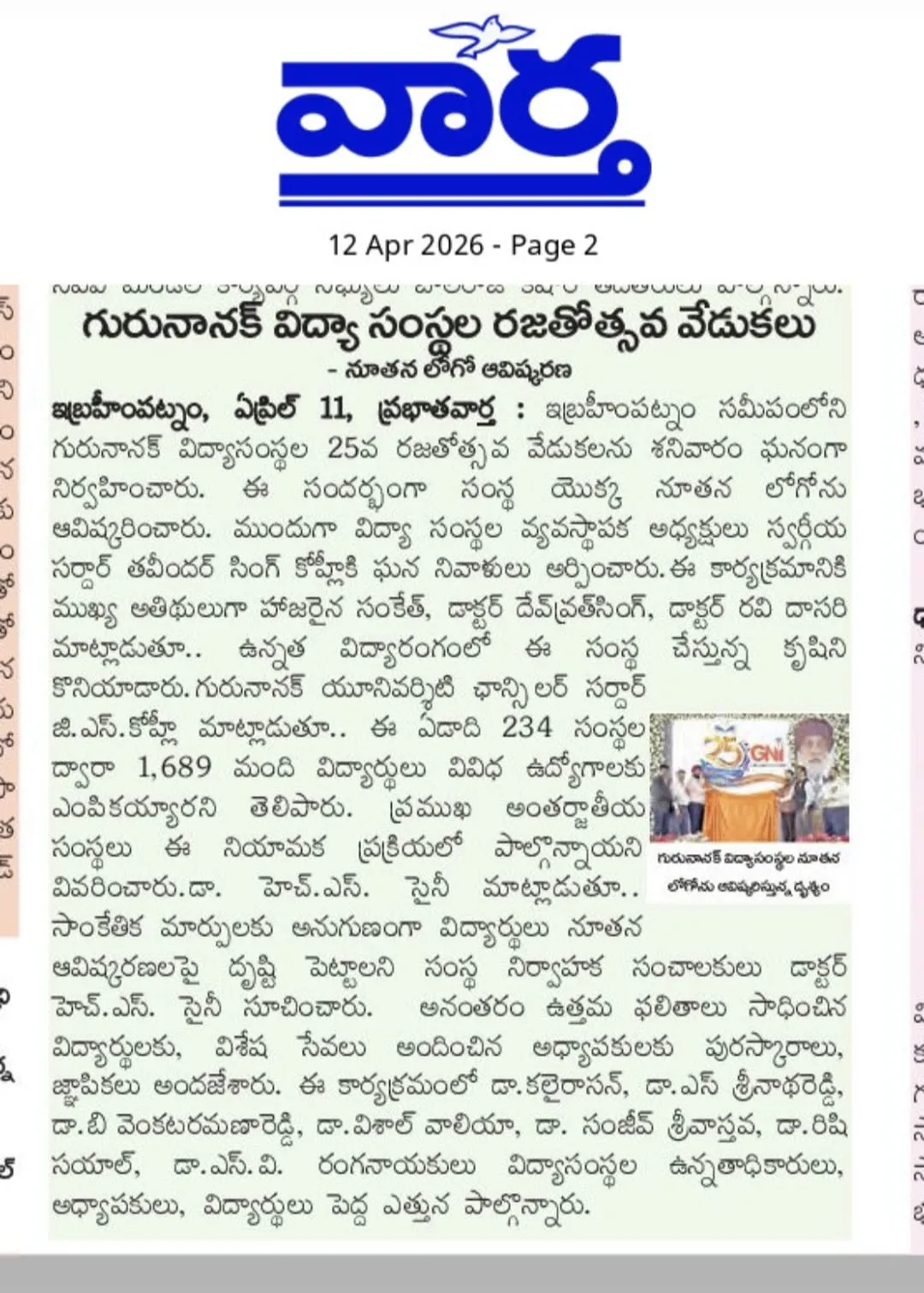 Guru Nanak Institutions—comprising Guru Nanak Institutions Technical Campus (GNITC), Guru Nanak Institute of Technology (GNIT), and Guru Nanak University (GNU), established under the aegis of the Guru Nanak Educational Society near Ibrahimpatnam—celebrated their 25th Silver Jubilee with great grandeur and enthusiasm. On this significant occasion, a new institutional logo was officially unveiled, marking a milestone in their journey of academic excellence.