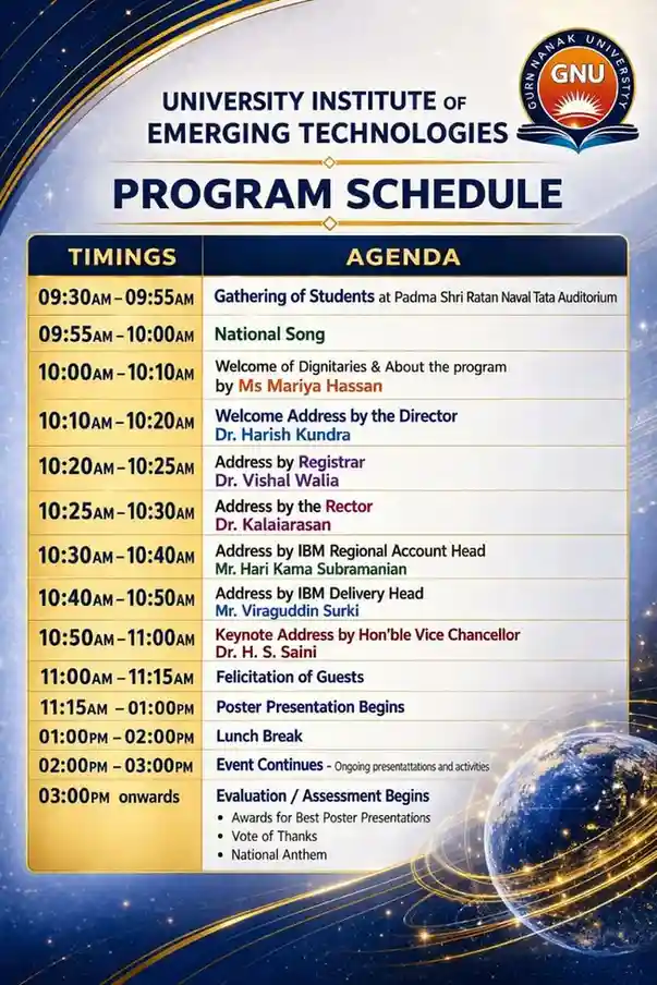 The University Institute of Emerging Technologies (UIEMT), Guru Nanak University, Hyderabad, successfully organized the Inaugural Ceremony of the 24-Hour Hackathon in association with the IEEE Student Branch and Space Apps India, as part of NASA Space Apps Challenge - 2026. The inaugural session, held at the Shaheed Bhagat Singh Auditorium, witnessed enthusiastic participation from students, faculty, and industry representatives. The event was graced by the esteemed presence of the Hon’ble Vice-Chancellor, Rector and the Director.