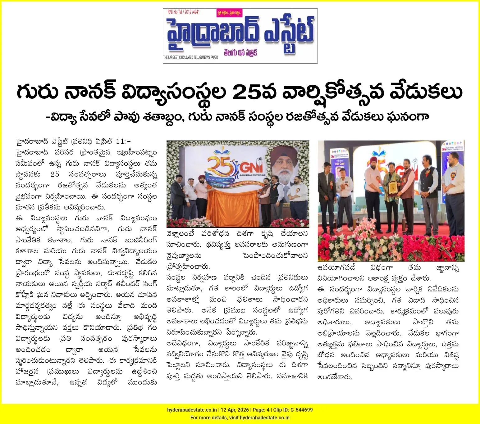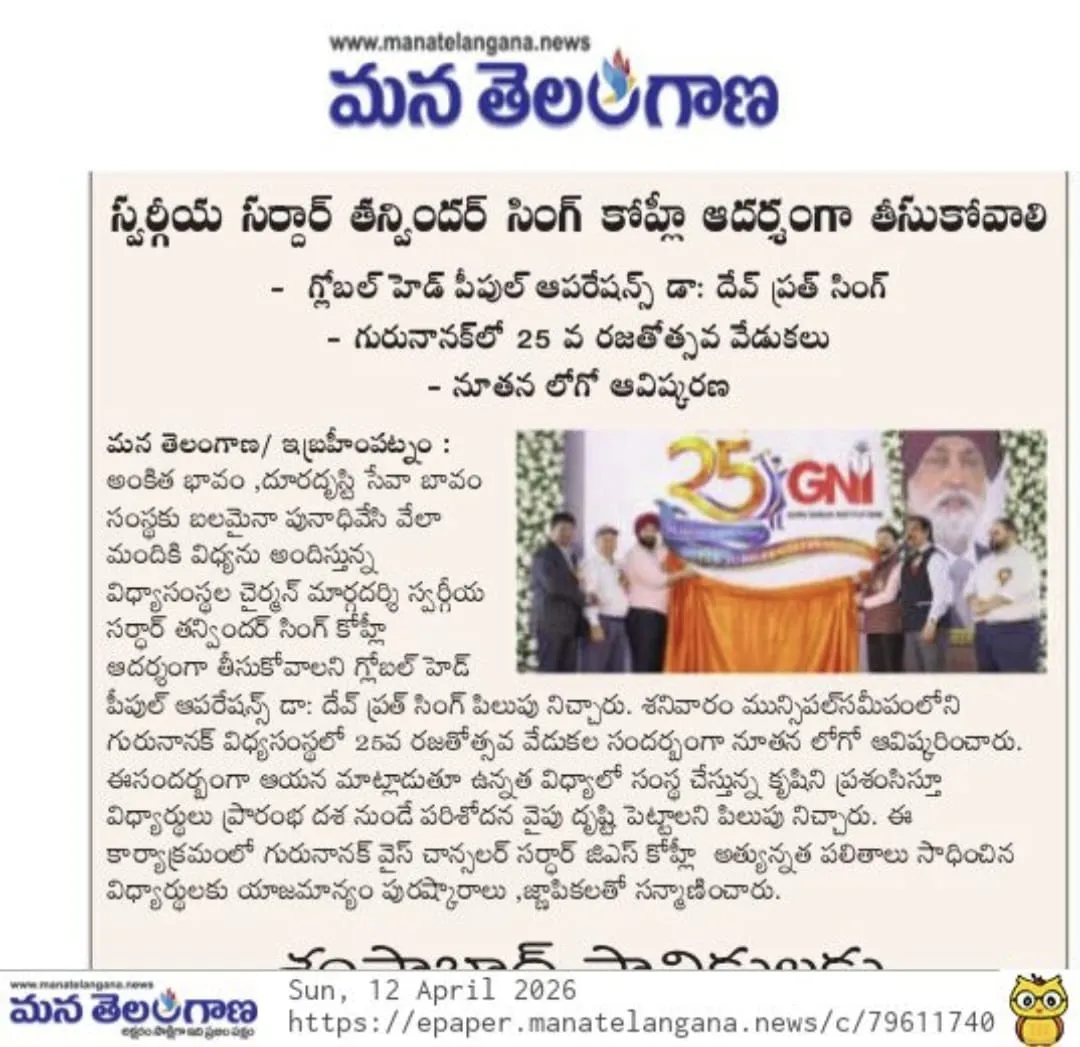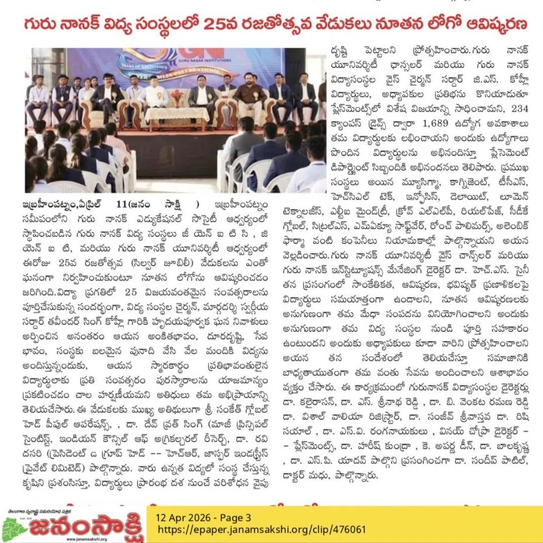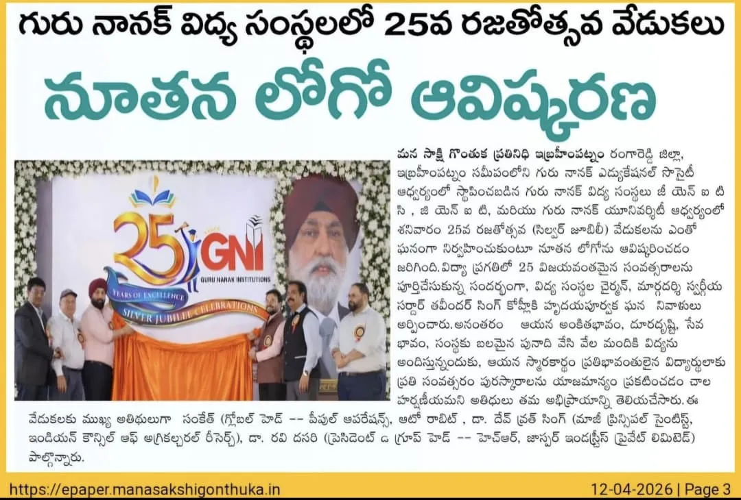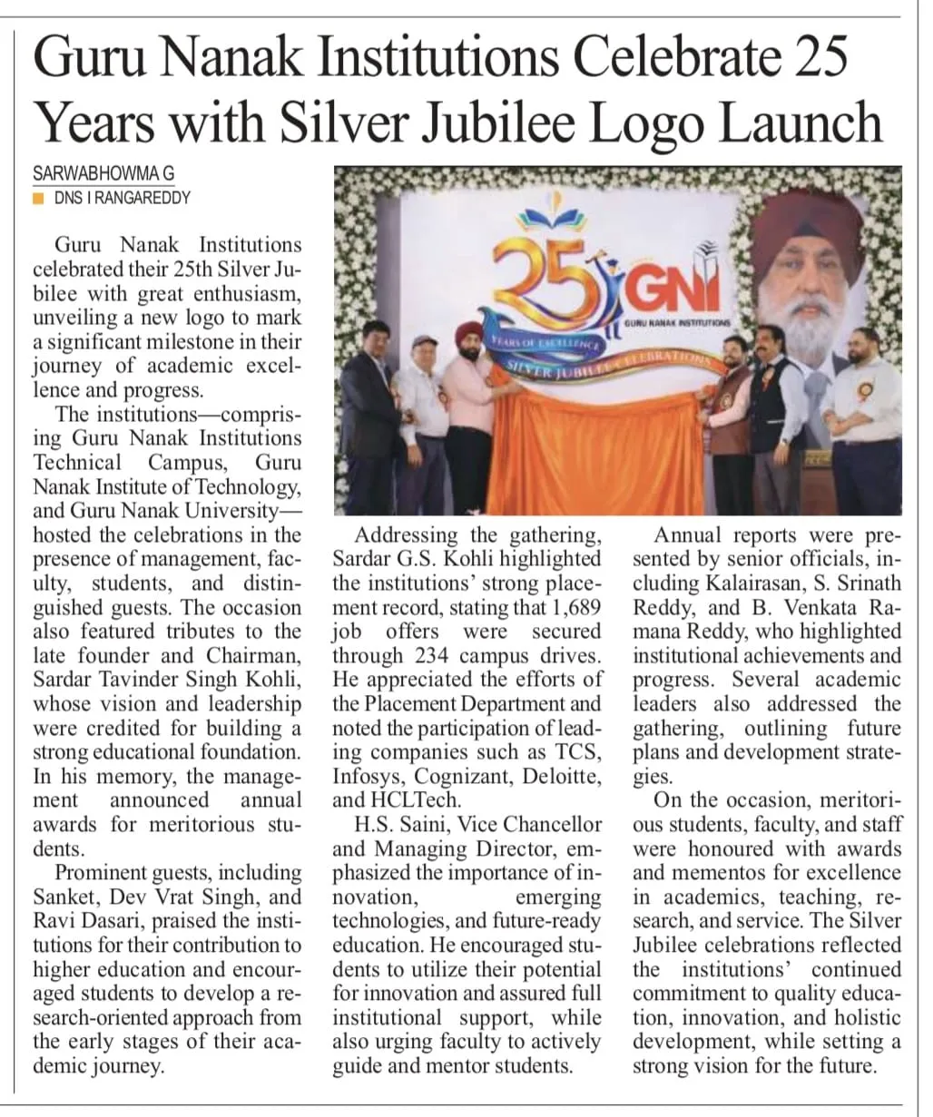 Guru Nanak Institutions—comprising Guru Nanak Institutions Technical Campus (GNITC), Guru Nanak Institute of Technology (GNIT), and Guru Nanak University (GNU), established under the aegis of the Guru Nanak Educational Society near Ibrahimpatnam—celebrated their 25th Silver Jubilee with great grandeur and enthusiasm. On this significant occasion, a new institutional logo was officially unveiled, marking a milestone in their journey of academic excellence.